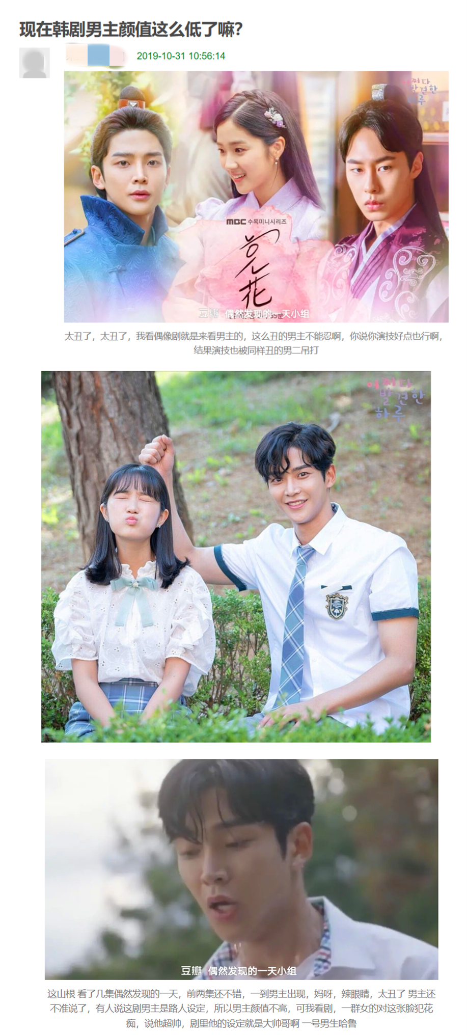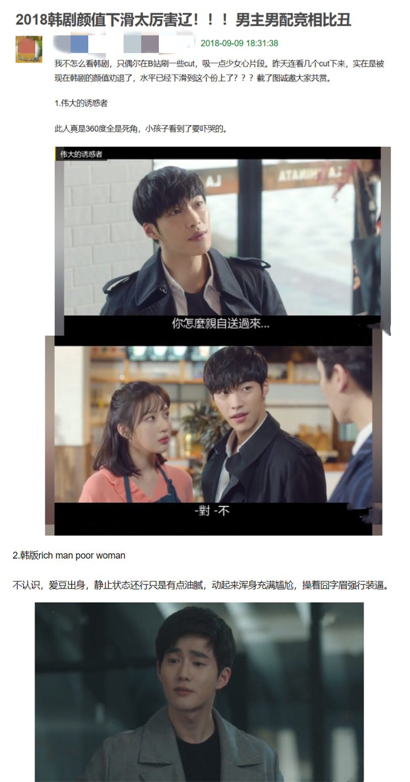 比如前两年的韩剧《伟大的诱惑者》,男主余桂欢的长相就被很多观众质疑,甚至有观众说他的‘360度都是死路一条,小孩子看到会哭’。还有韩国版《富贵男与贫穷女》,男主金俊明被观众形容为‘油腻’,五官一动就会出现‘尴尬眉毛’,一点都不清爽的帅哥。