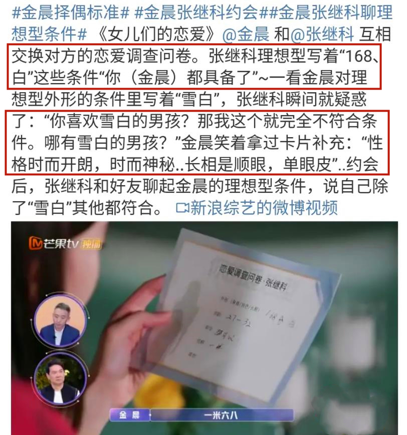 但是吉娜对张继科不太满意。吉娜写的理想标准是‘外表白皙,单眼皮,时而开朗,时而神秘,赏心悦目’。再看着章继科,他看起来气色不错。吉娜的眼睛不太清楚,但看起来他的皮肤很白,眼睑很单一,时而开朗,时而神秘。然而,当张继科和朋友讨论吉娜的理想条件时,他说除了《白雪公主》,他什么都遇到了.网友开玩笑说,张继科真的很自信。
