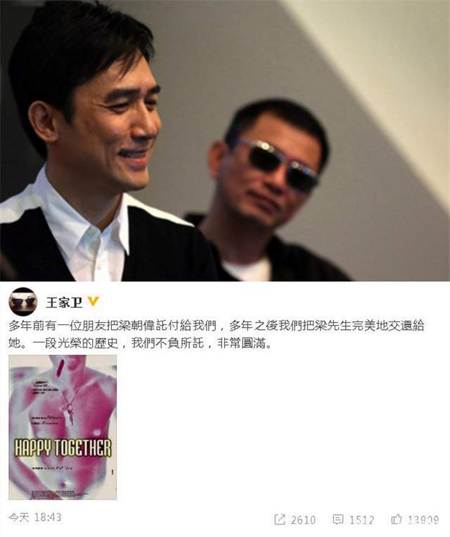 可惜,天下没有不散的宴席。两年前,梁朝伟的合同到期,结束了他与王家卫公司20年的合同关系。当时王家卫也在微博上发消息,说和梁朝伟合作的那段时间是辉煌的历史,非常成功。可以说王家卫对梁朝伟情有独钟。