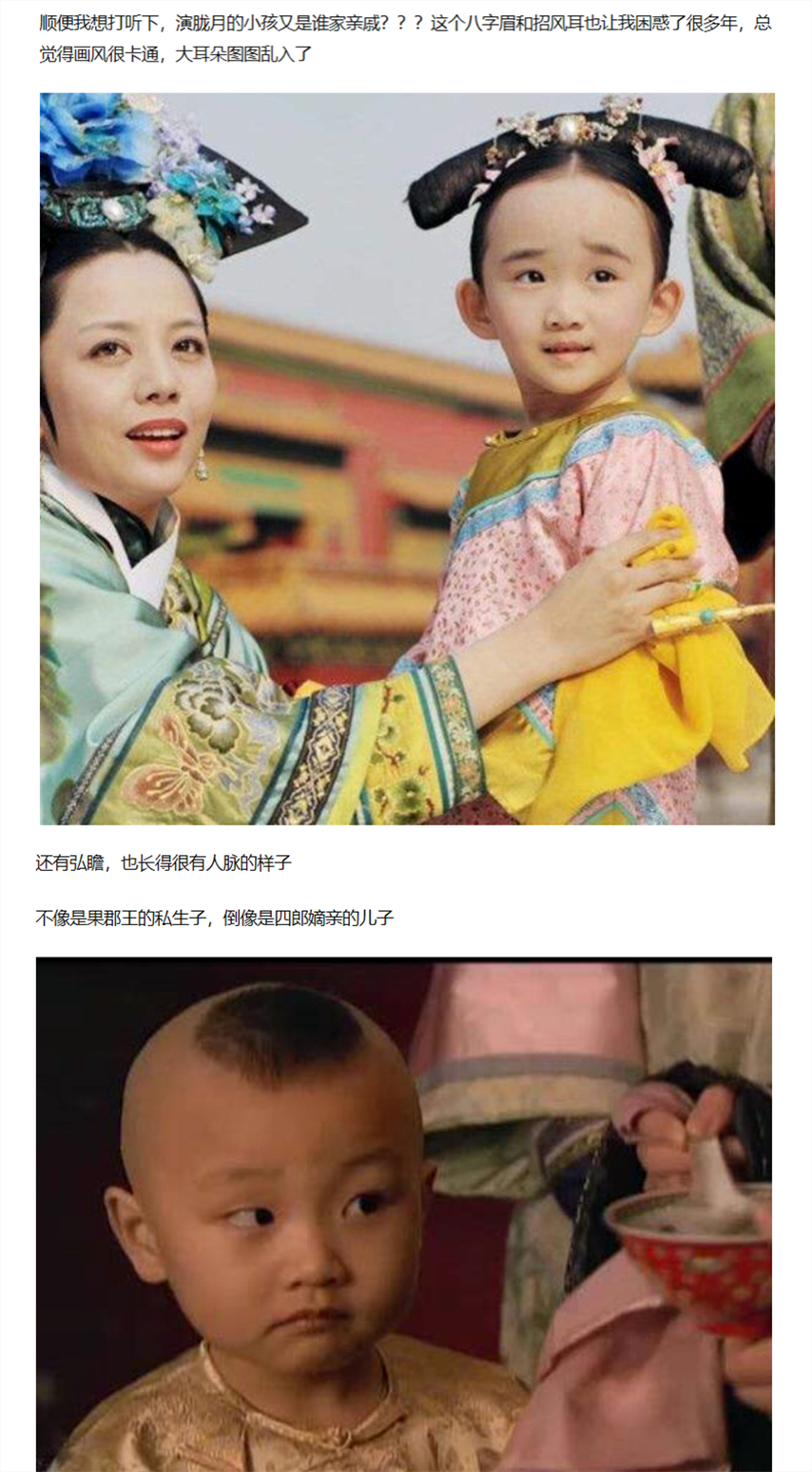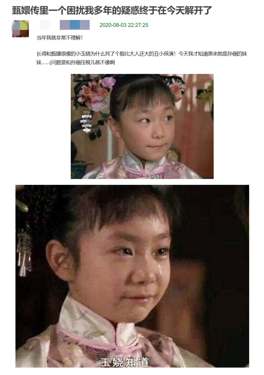 比如9年前《甄嬛传》爆炸。有网友曾经写道,看剧的时候看不懂像甄嬛的小宇饶的设定。“你为什么会发现一个比大人脸还大的丑孩子,”原来,那个小朋友就是孙俪女主演的同父异母姐姐孙艳.既然是女主演的妹子,演和女主演很像的小宇饶又有什么关系呢?