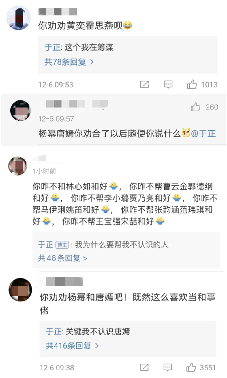 最搞笑的是,网友要求郑宇调解唐嫣杨幂、水晶霍思燕等人,他回应了。结果,当他来到郭德纲曹云金时,他闭嘴了。网友说一定是太难了,他选择闭嘴。有网友吐槽是‘死丫头想当和平鸽’,是‘居委会阿姨属性暴露’。郑宇本人可能无法想象他评论区的风格会变成这样。