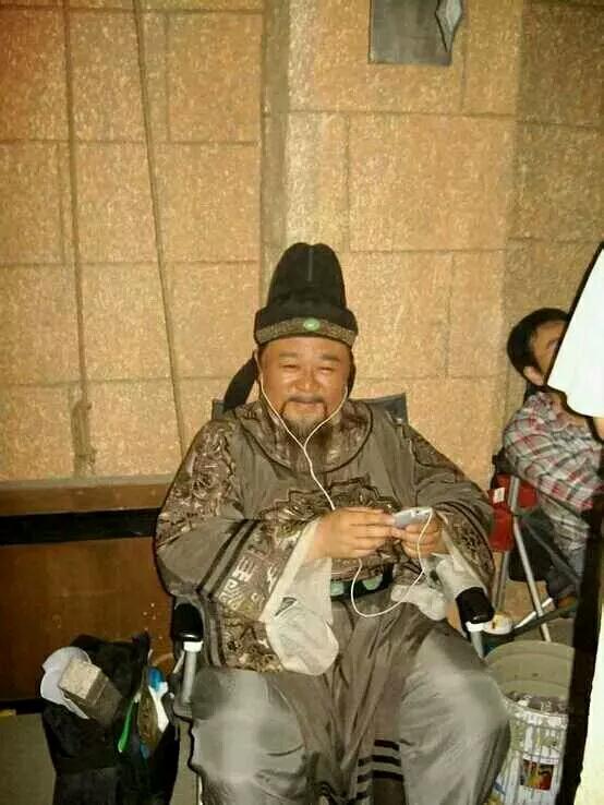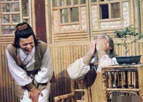 图为剧中饰演郭靖和老顽童的秦煌。这时,他们笑了,因为翁美玲把《九阴真镜》一行读成了《走音真镜》。