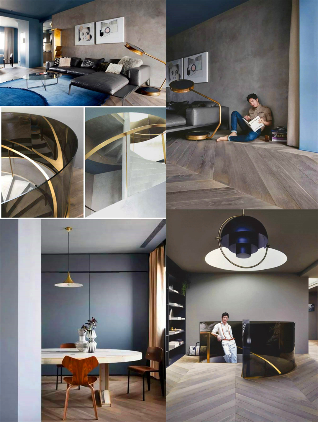 井柏然的家是水泥墙,大部分家具都是深色的。整个环境很平静,很平静。但这样的装修也很有可能让人感到沉闷和压抑,景博然巧妙地运用了一些关于色彩的小心思,成功避免了这一点。他用了少量的铜,木质的地板,一张鹅白色的圆形大理石桌子,成功的打破了沉闷的环境,极大的提升了整个家的质感。
