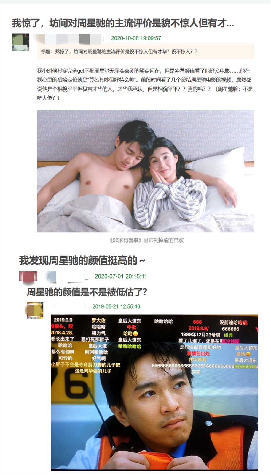 有网友说,周星驰的面值被低估了,因为他同时代的美男太多了!想想周星驰那个时代,香港娱乐圈的巅峰时期,被张国荣、梁朝伟、四大天王、周润发这样耀眼的帅哥包围,可爱的小帅哥就被忽略了!不过周星驰从来没有在合影中被人说突兀。和作品里那么多美女搭档也让人觉得很和谐,其实不是因为周星驰的面值不低,所以她能承受!