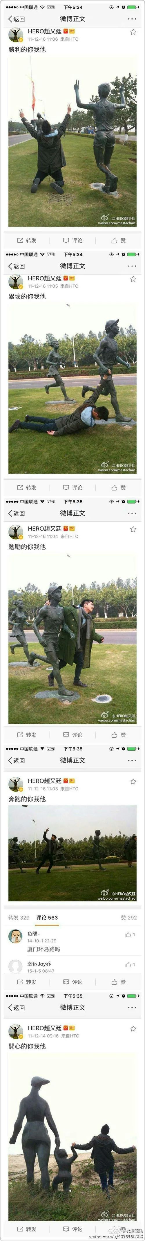 微博的画风也挺奇怪的。我总是喜欢用各种青铜雕像自拍,让我看到头上有个问号,被夸的手僵在空中.
