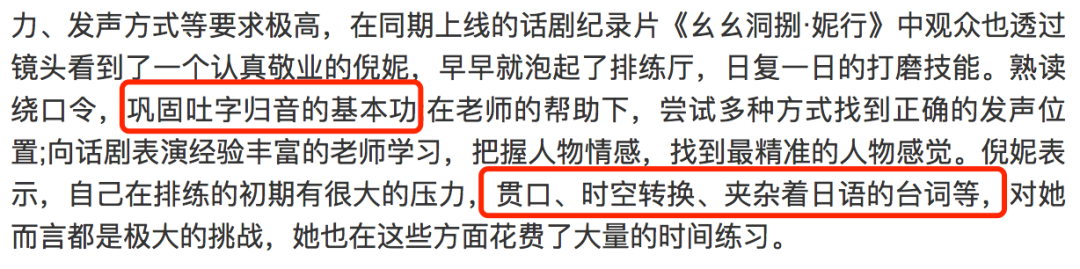 除了《宸汐缘》之外,倪妮在其他影视剧里都是原音出演,学播音专业出身的她,口条完全没问题,后来为演话剧专门练过发声和台词,现在吐字清晰、字正腔圆、中气十足、声线浑厚。在85花里,倪妮的声台形表等业务能力都稳居前列。