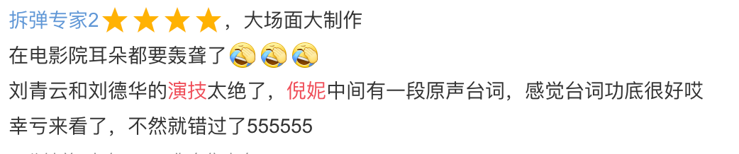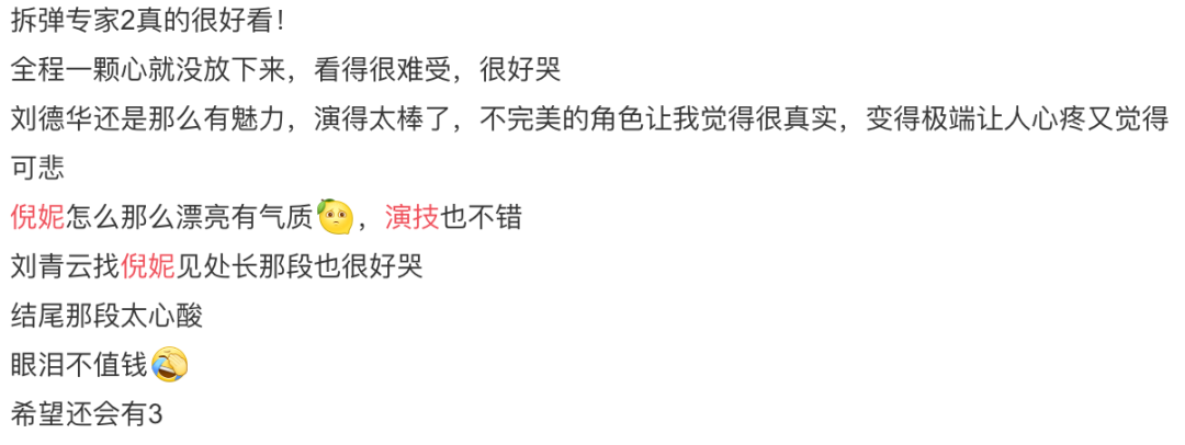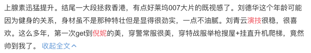 除了像成龙附身一样绝望的刘德华,演技从未下降的刘青云,整个过程肾上腺素激增无尿斑的故事加分,但《拆弹专家2》最让肖剑惊讶的是妮妮和终于看到一个在港片里不违和的内地女明星了!