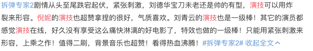 2020年圣诞电影,《拆弹专家2》应该是话题度和口碑度最好的,豆瓣评分高达8分,连续多天票房第一,排片第一,总排第一,也让很多人看完电影感叹“港片没死”。