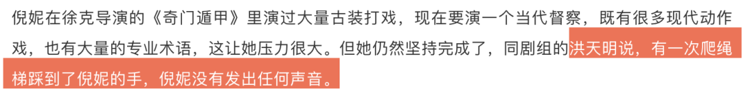 在拍摄爬绳梯的画面时,倪妮的手被洪天明不小心踩到了,但她为了保持戏的连贯性,愣是一声不吭。
