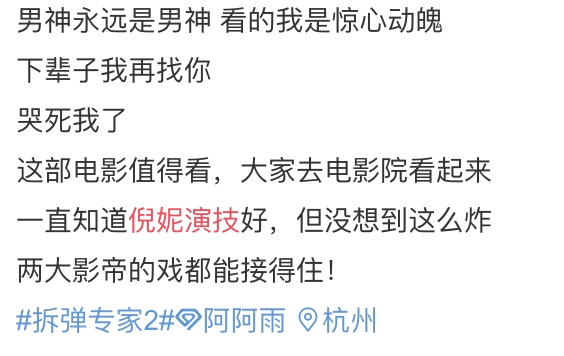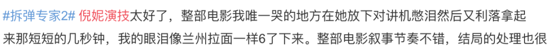 倪妮此前在出席活动时委婉表示自己没有作品而不愿意接受采访,看完电影,我只想说,第一次演警察的倪妮,为《拆弹部队2》里的庞玲一角注入了其个人风格,倪妮代表作+1。