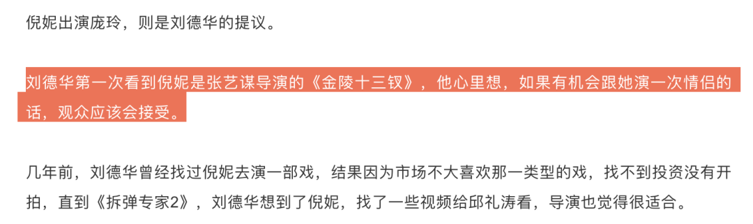 其实,刘德华在看了《金陵十三钗》之后就想跟倪妮合作,结果第一次没合作上,直到《拆弹专家2》启动,刘德华向导演邱礼涛推荐了倪妮,还特意找了一些倪妮的视频给导演看,于是才有了这一次合作。