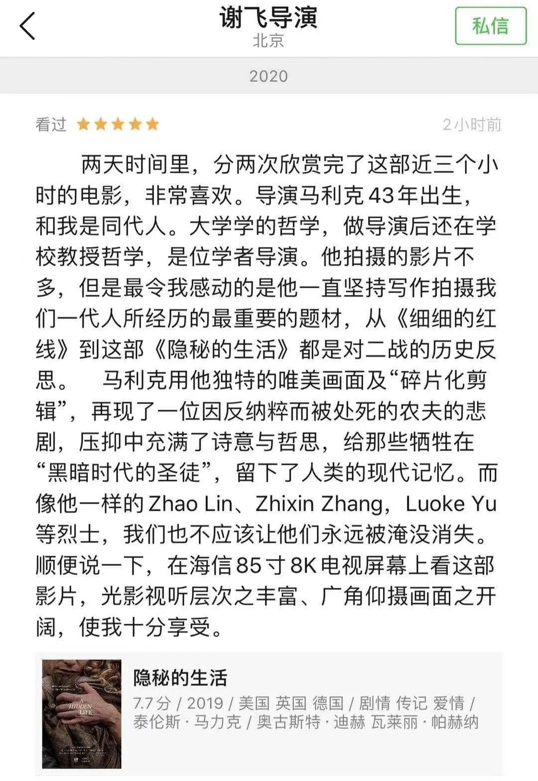 海信独创的ULED画质技术和画质调教,可以为观看者提供最舒适的视觉体验,高保真无损天籁声扬也能让观看者体验到媲美家庭影院的沉浸音质。导演谢飞体验过海信电视后,特地在豆瓣上赞叹了海信ULED 8k电视绝佳的视听效果,从专业角度评价了其对于画面层次、拍摄手法的完美展现。