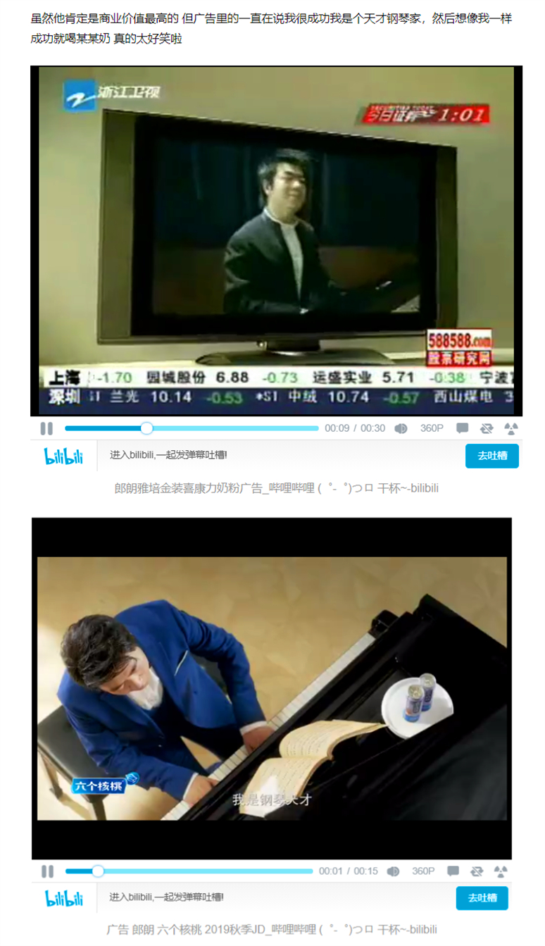 不仅如此,网友还说郎朗的广告也是凡尔赛,口号是‘我很成功’,‘我是天才钢琴家’,‘想和我一样成功就喝点牛奶’。狄云的广告不那么浮夸和傲慢,让人看起来舒服多了。