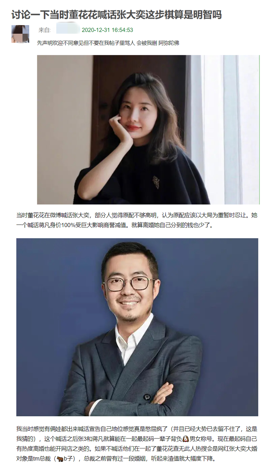 当董华华刚刚透露丈夫和外面的女人没有正当的关系时,很多网友都觉得她很聪明,似乎是个很难相处的人。但是现在,张大奕似乎在他的位置上成功了。很多网友不禁疑惑:董华华是不是打败仗了?如果她不在微博上大喊大叫,默默离婚,能得到更多财产吗?毕竟,她的宣传极大地影响了范姜的社会地位,她离婚后得到的钱会更少。