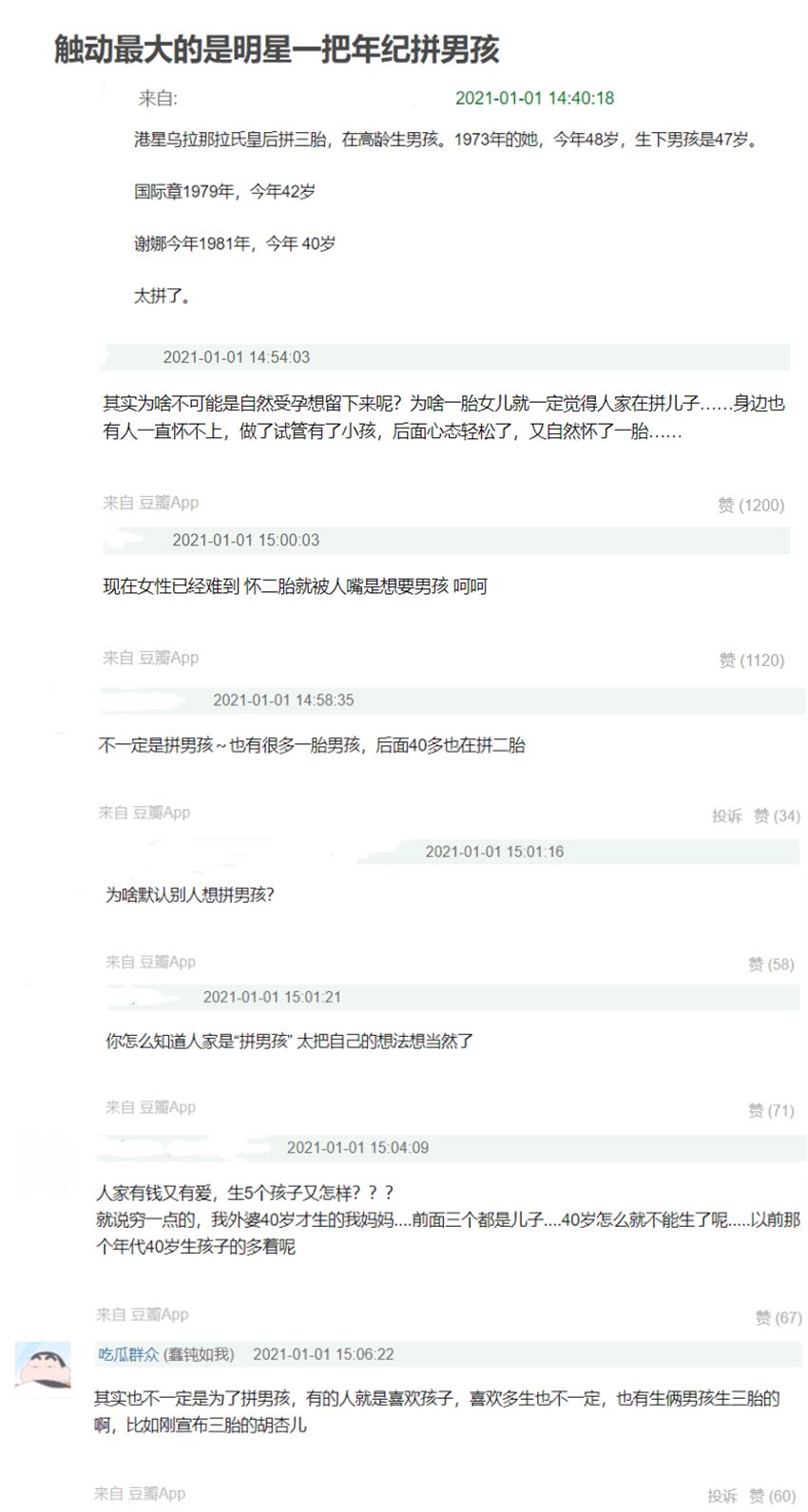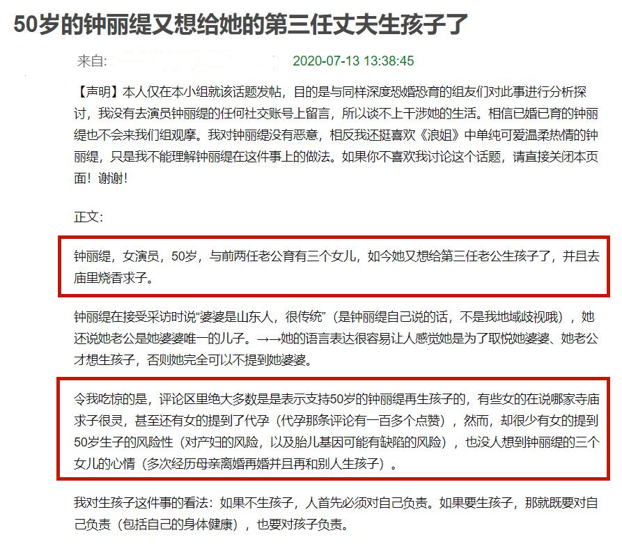 有网友说:章子怡1979年出生。她生小儿子的时候41岁。娜娜出生于1981年。估计她生二胎的时候快四十了。还有艾琳。虽然艾琳比前两个小,但她出生于1984年。今年她也跑到了37岁,确实属于高龄孕妇。这些女演员除了高龄争取二胎都是女儿。所以网友一方面心疼这些女演员,一方面又忍不住猜测要不要儿子。