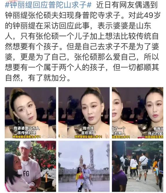 近50岁的钟丽缇在过去几年里结过两次婚,前两任丈夫育有三个女儿。现在她嫁给了张伦硕,年纪大了,想投胎,甚至去寺庙烧香要孩子。钟丽缇在接受采访时说,婆婆很传统,而张伦硕是独生子,她也喜欢孩子,所以很想拼个儿子。