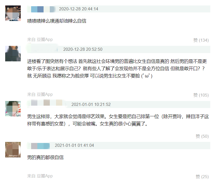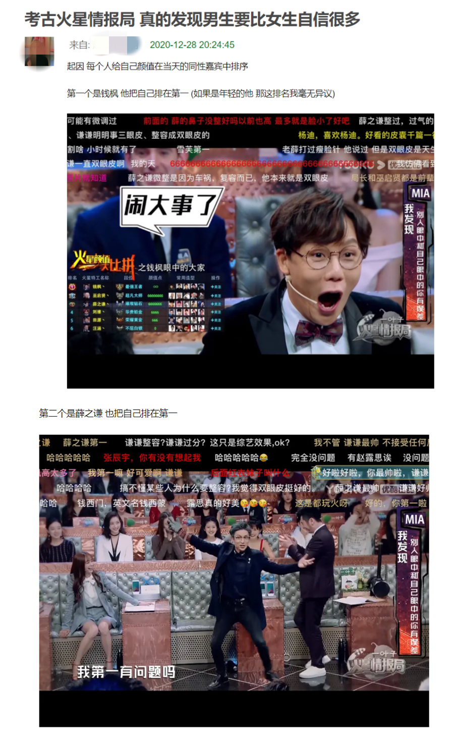 其实不论男女,都不应该对其进行身材羞辱。但还是有不少网友认为,社会就是对男女的宽容度有差,就比如在身材方面。而在这样的社会环境下,男性在自信上面,比女性高出了一大截。有网友发帖说自己看了《火星情报局》,在这个节目里感受到了男女的自信度差异。