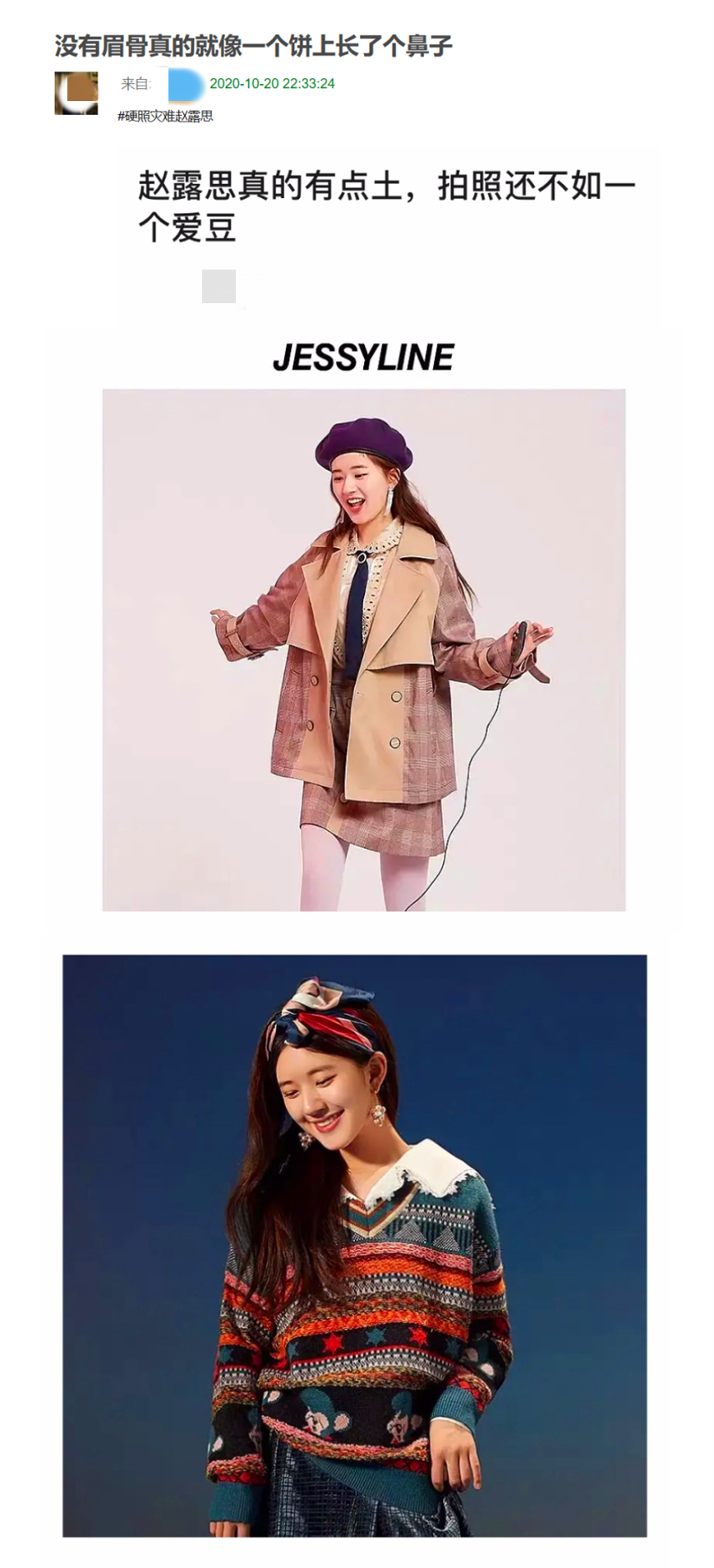 近日,赵露思为女装品牌Jessyline拍摄了一系列广告片。但照片曝光后,有网友说赵露思‘土’,说‘没有眉骨,真像蛋糕上有鼻子’。这句话听起来没那么好听,没那么难听,但却是真的。熟悉赵露思的人都知道,她是一个甜美可爱,大眼睛,高鼻梁的女孩。可惜眉骨不高不明显。