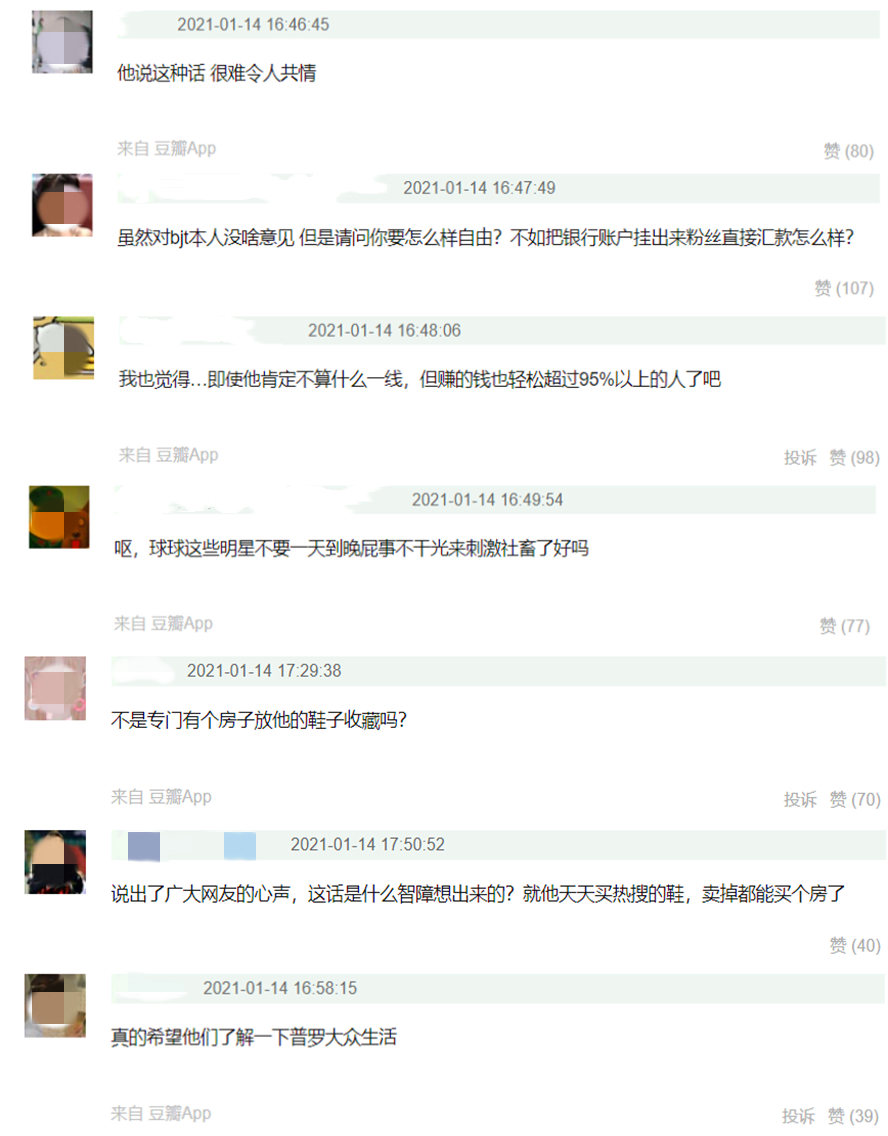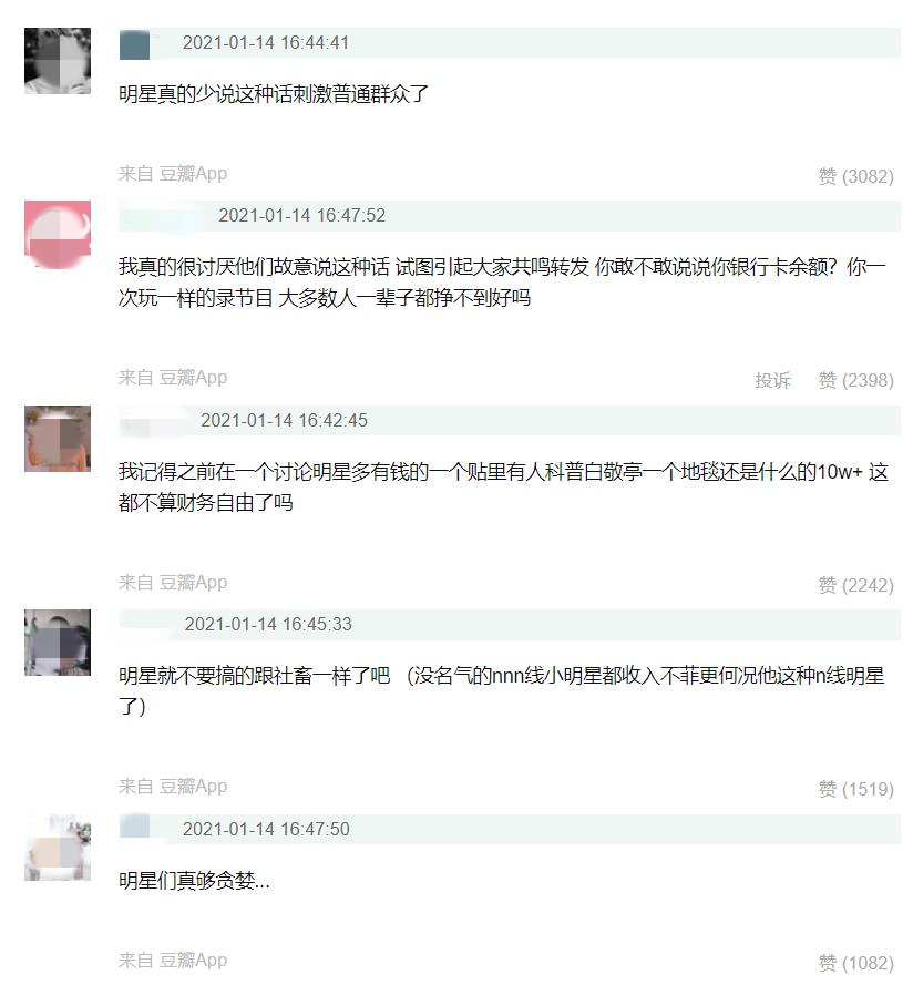 有网友这样抱怨:我真的很讨厌他们(明星)故意说这样的话,试图引起大众共鸣和转发。但是,你(明星)有没有想过,你录制一个节目赚的钱,是大多数普通人一辈子赚不到的钱?你(白敬亭)敢说自己的银行卡余额吗?有网友说:明星可以不再说这种话,不再刺激普通人。有网友认为娱乐圈的明星真的很贪心。