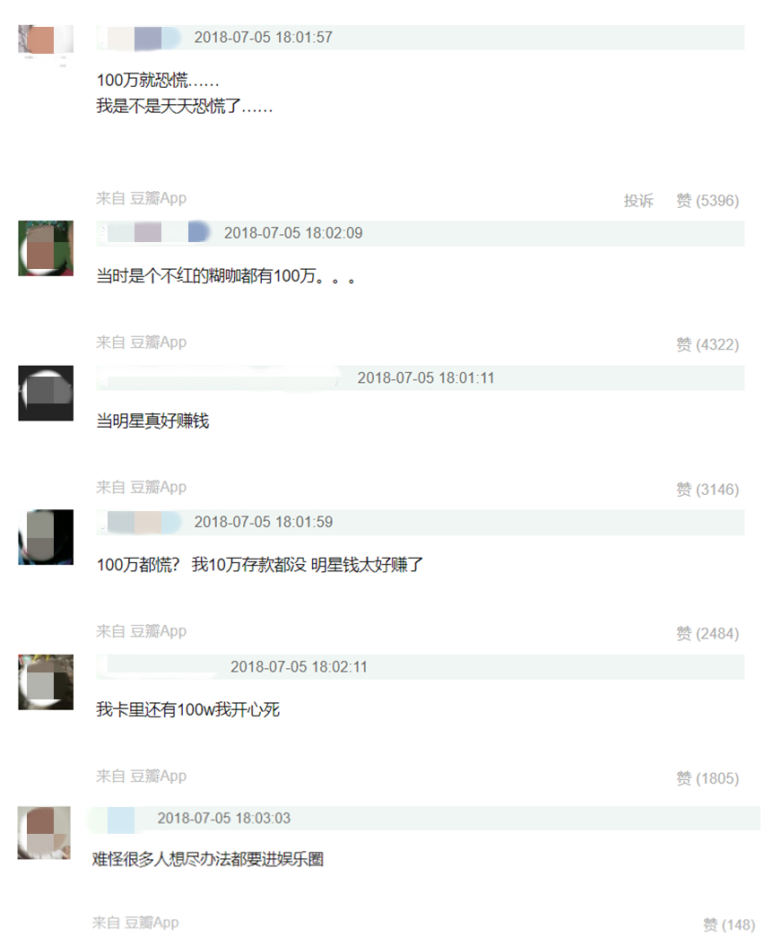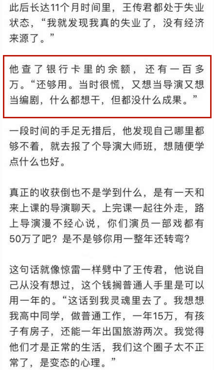 这句话引来了不少网友的评论。有网友感慨说,明星的钱真的好赚。要知道王传君只有在三线之外才能在娱乐圈赚那么多,更何况是被三线打中的明星。有网友悲哀的说,一百万人恐慌,多少普通人一辈子挣不到一百万,岂不是天天恐慌.有网友嘲讽说要开银行卡余额,发现还有一百块,很惊讶!