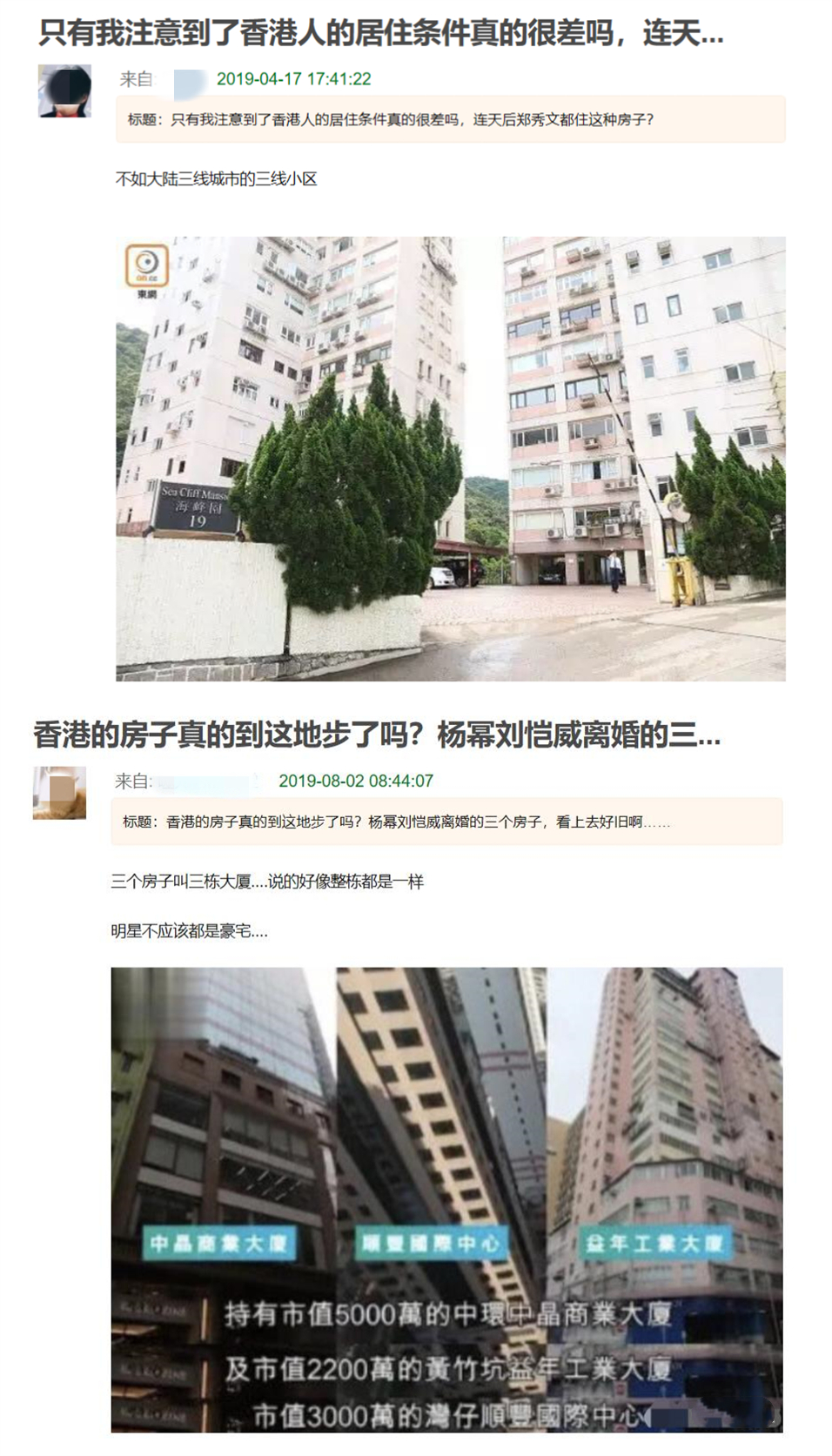比如刘华威和杨幂离婚时,媒体披露了他们在香港的房产,每处房产价值高达数千万。但是大陆网友还是觉得这些房子很旧,看起来不像几千万。还有香港歌坛天后郑秀文,她的房子也被媒体曝光。大陆网友看到后说不如大陆三线城市的三线社区。