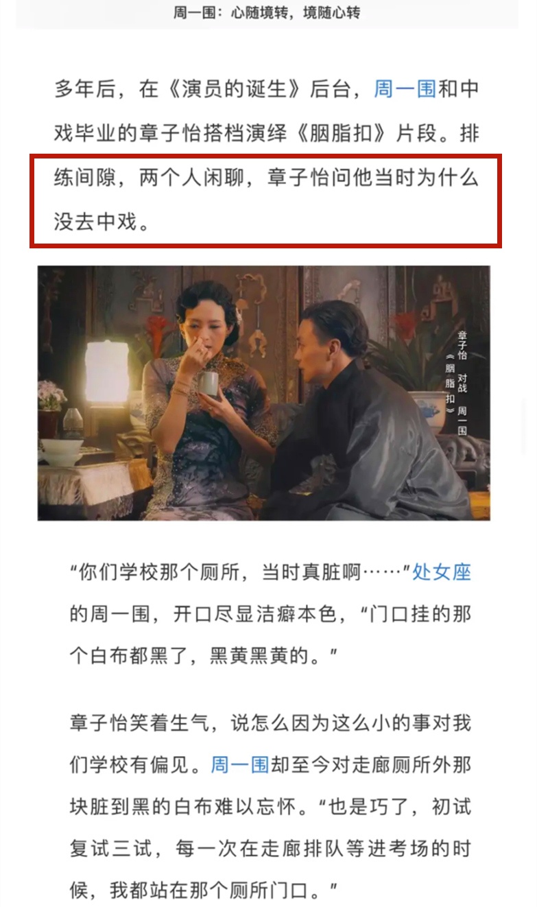 ,难怪章子怡会问了。当然了,章子怡也可能以中戏为豪,觉得周一围那么优秀,本应是中戏的。还有网友调侃,说中戏赶紧整整厕所!要不然今天看《上阳赋》就是看夫妻档了!(doge.jpg)