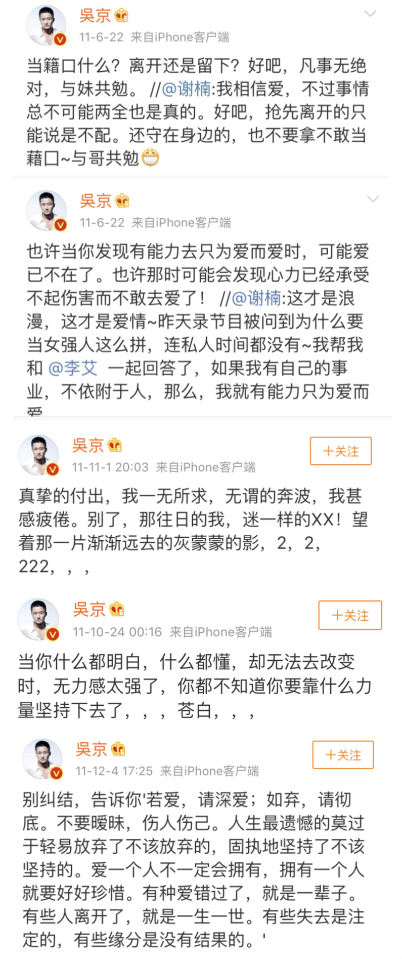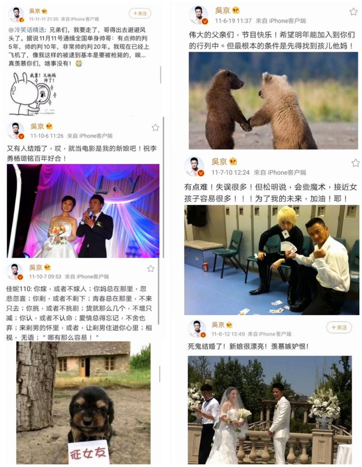 作为最早定居微博的明星之一,吴京真的把微博当成了QQ空间,想说什么就说什么,想表达什么就说什么。也正是因为如此,考古网友以后可以通过他的微博找到很多段子。