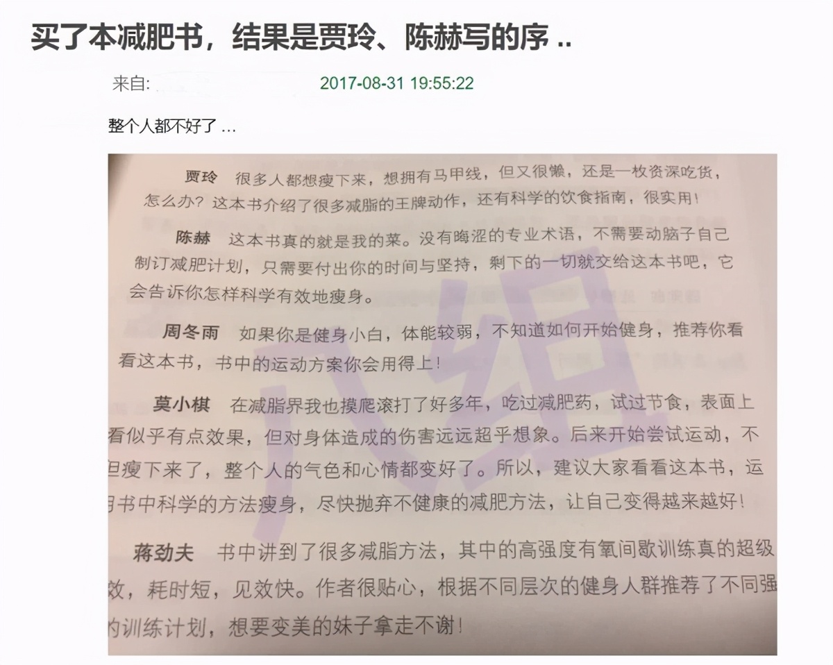 减肥还有一个有趣的地方。三年前,一位网友贴出自己买了一本减肥书,结果是贾玲和陈赫写的序言.这让他变得很坏。毕竟贾玲和陈赫跟苗条没关系!其他网友看到这个帖子,也加入了调侃。有人说这两个人写序言,是劝他们退出。有些人说如果蒋欣能一起写作就更好了.害!网友抢竹笋!