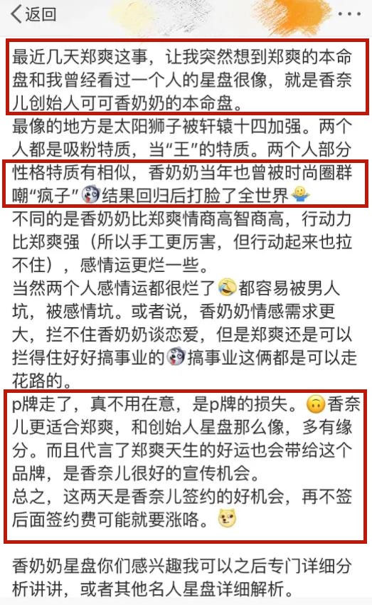 一开始是一条微博。1月23日,当郑爽被有关部门封杀时,郑爽的一位粉丝透露,他给郑爽看了星盘,并预言郑爽很快会翻身。不仅如此,翻盘后郑爽还会签约做代言人,代言费甚至还会涨。