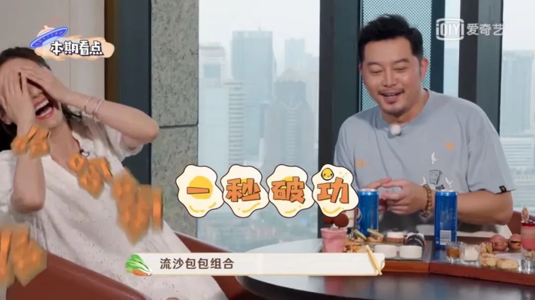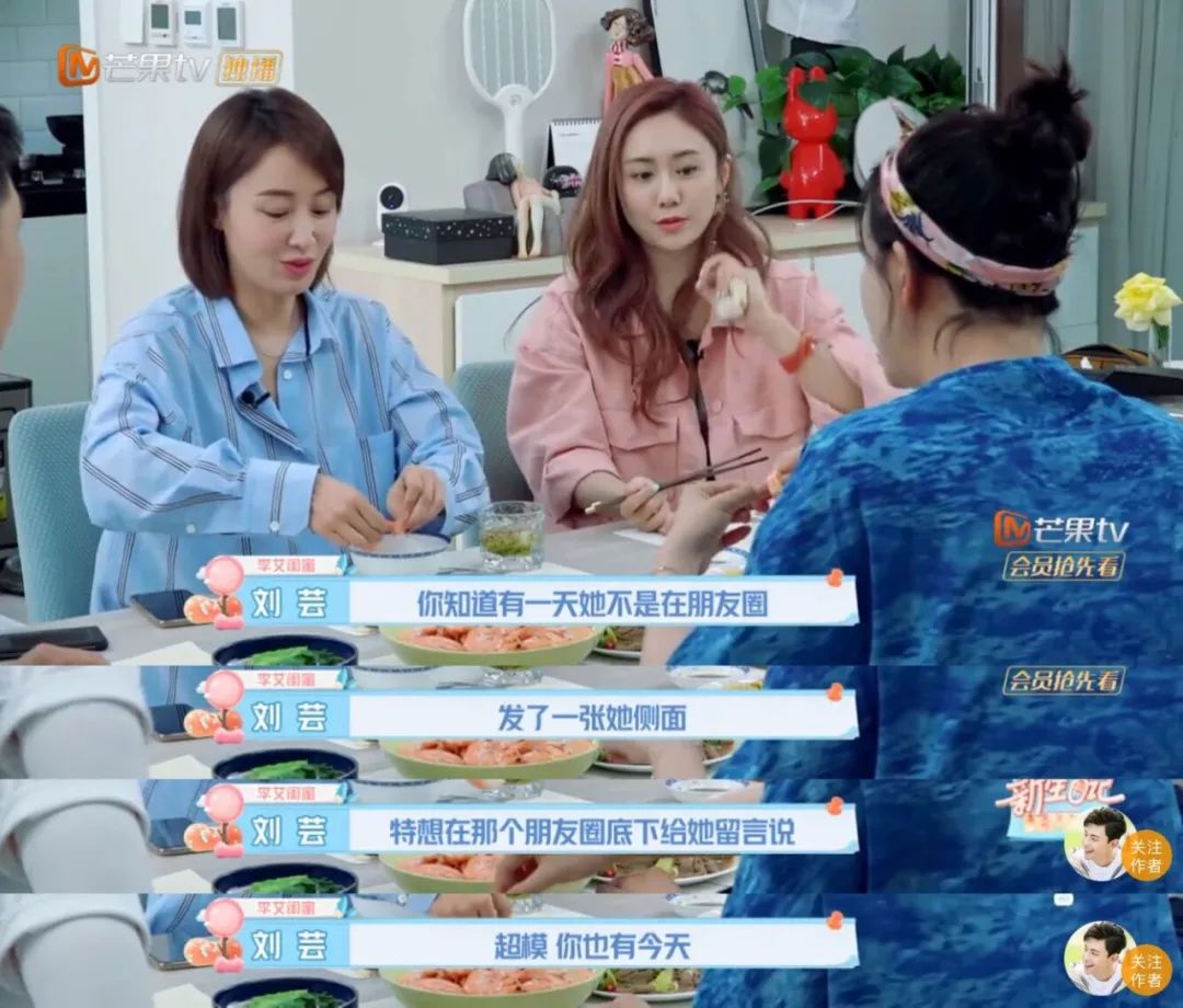 《新生日记》里与怀孕的好友李艾一起吃饭,刘芸在饭桌上金句频出,与李艾你来我往,互相拆台,好端端的温情聚会现场,硬是让刘芸变成了德云社开箱演出。