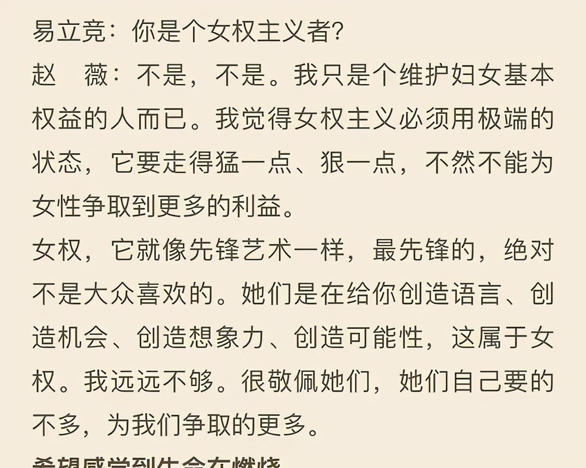 娱乐圈中的女明星有许多影响力都很大,她们其中也有人曾为女权发声。赵薇曾经谈到,自己不是一个女权主义者,自己只是维护妇女基本权益的人。女权是要争取更多的权利的,这条路会走得更猛,才能帮大多数人争取到实实在在的权利。赵薇的观点非常具有前瞻性,可以说十年前的她就已经意识到了女权是什么。
