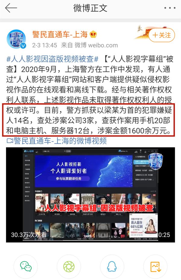 近日,上海市公安局通报了一起大型跨省影视作品版权侵权案件,该犯罪嫌疑人团伙是网上知名的“人人影视字幕组”。在警方的报告中,有两个惊人的数据,即“14名犯罪嫌疑人被捕”和“涉案金额超过1600万元”。很多网友看了觉得大家的字幕组彻底凉了,回不来了。