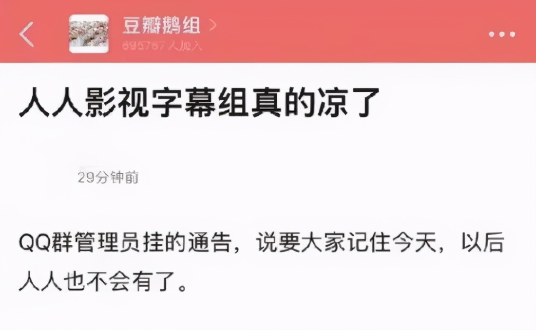 其实大家的影视字幕组都出事了。上个月9号,豆瓣平台上出现了一个名为《人人影视字幕组真的凉了》的帖子。帖子里提到“QQ群管理员跟大家说完了”,几句话让很多剧迷感到焦虑。