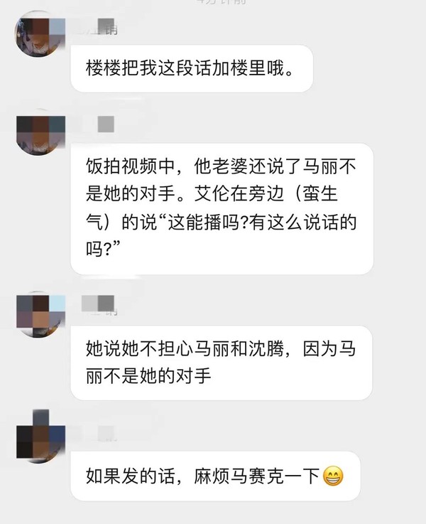 不仅如此,事后还有网友爆料,说饭拍视频中,艾伦大概觉得沈腾妻子的言论不妥,便有些生气地说“有这么说话的吗?”可沈腾的妻子却称自己不担心马丽与沈腾有什么暧昧关系,因为马丽不是自己的对手……这番言论,令不少粉丝及网友感到不满。大家虽然能够理解沈腾妻子有可能“吃醋”的心情,但她在台上说这种让沈腾、马丽下不来台的话,真的情商堪忧。