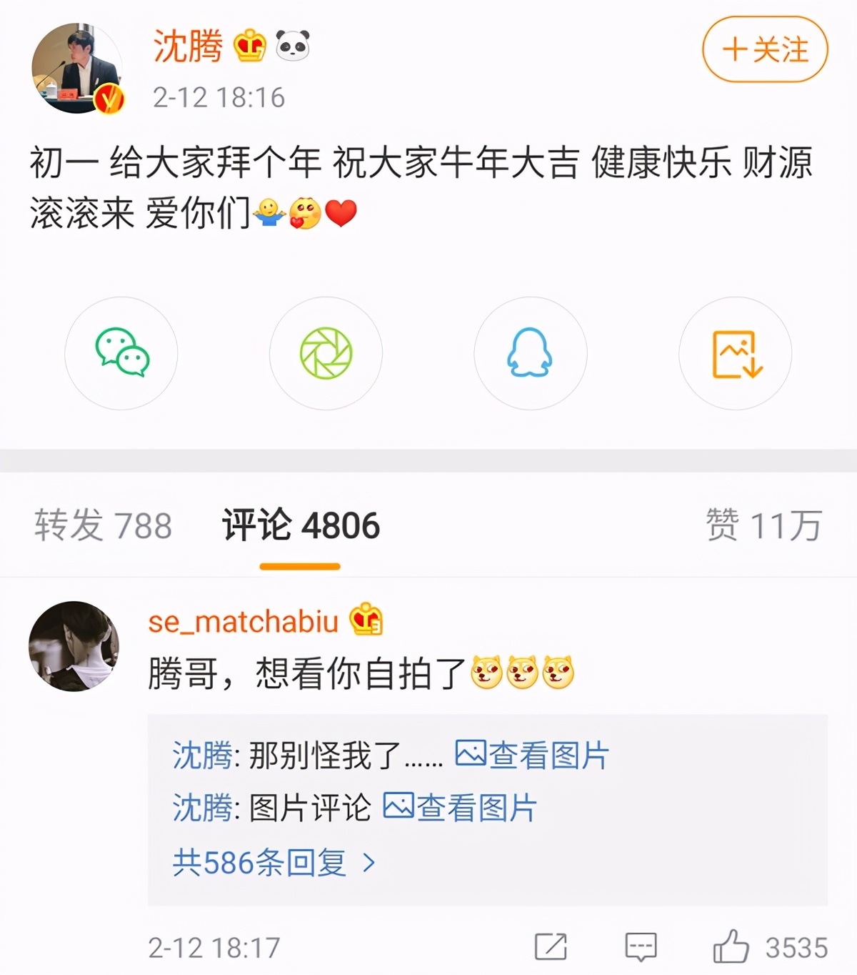 还有近日,马丽和沈腾也在微博上互动了。点开沈腾那条新春拜年的微博评论,便可发现马丽的踪影,她在新年跑去调侃沈腾、讨要沈腾自拍来了。而沈腾呢,他也大大方方回了马丽,并附赠两张自己的“他拍照”。