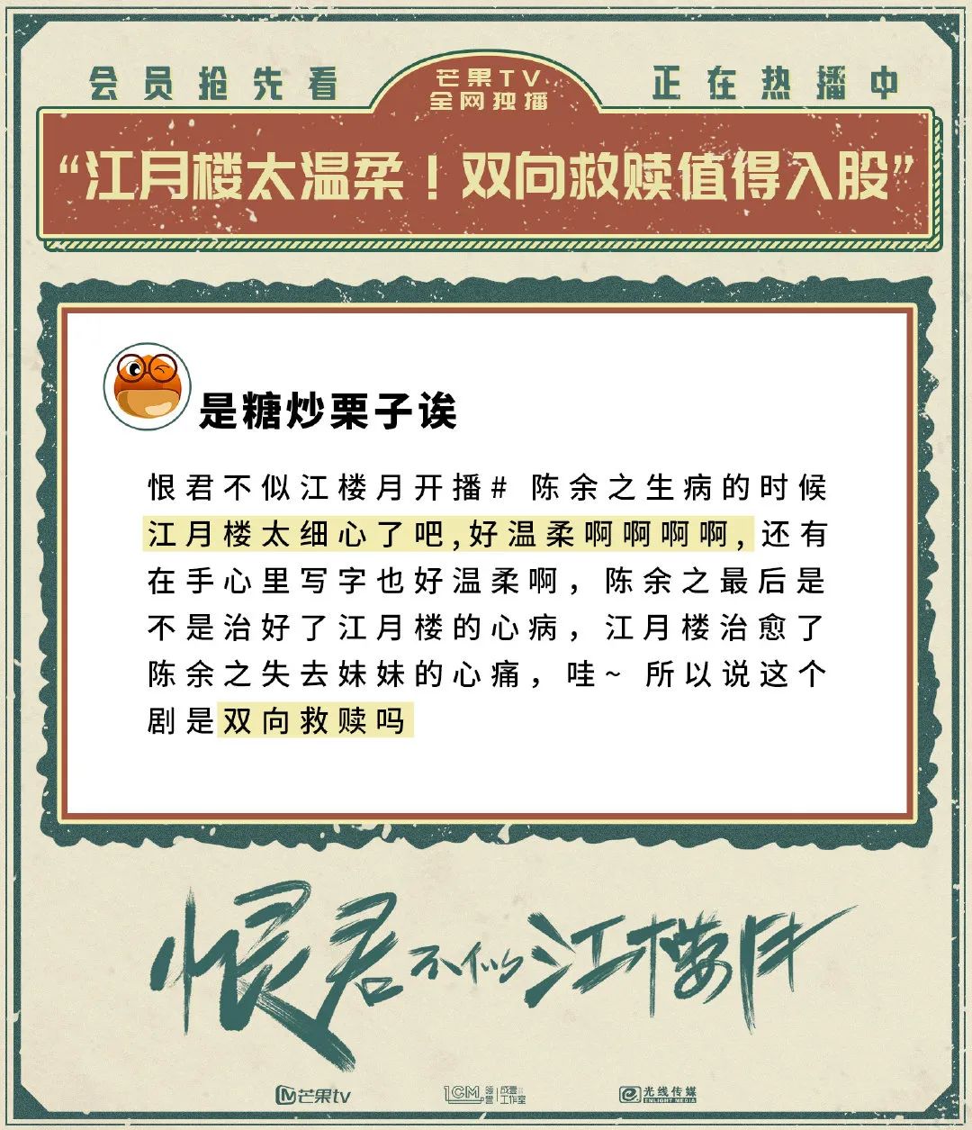 我们看剧最重要的是看剧里的cp。只要两个玩家之间的友谊足够牢固,追剧人的热情就可以瞬间点燃。而《恨君不似江楼月》是瘾君子心中最标准的动人故事。