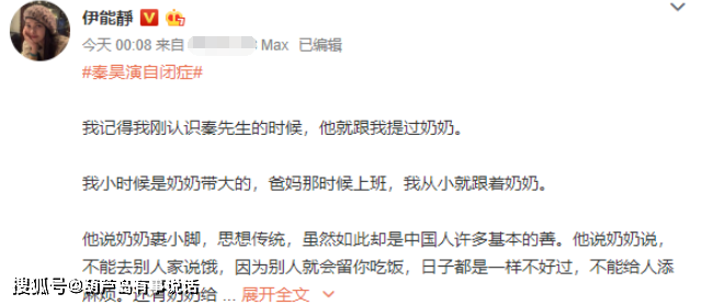 伊能静的行文中,怀念秦昊的奶奶是个传统的老人、心很善良。文末伊能静解释因为秦昊不善言辞,所以替丈夫感谢一直以来喜欢他的观众们,表示“美好的表演,不只是角色,可贵的是你还能看见教养”、“演员最大的快乐不是掌声,而是全身心专注的投入,能如此毫不保留的付出还有人喜欢,当演员真的很幸福。”