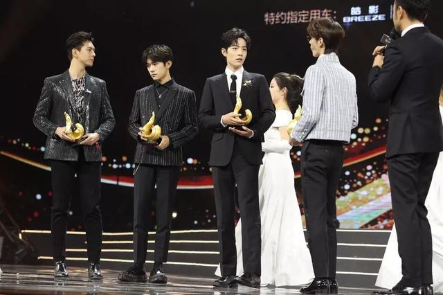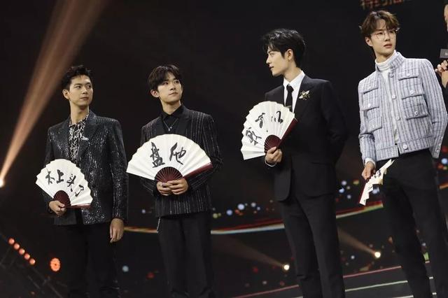 今年的“微博年度热度人物”选出来了四位男演员,李现、易烊千玺、肖战和王一博,四位男神齐齐登台,将整个2019年所有的流量捏在了一起。舞台上还安排了节目互动,让四位老公一人选一把能代表今年热词的扇子。“四大才子”的称号就这么凭空出世,他们现在就是官方盖章,成为新一代名副其实的顶流。