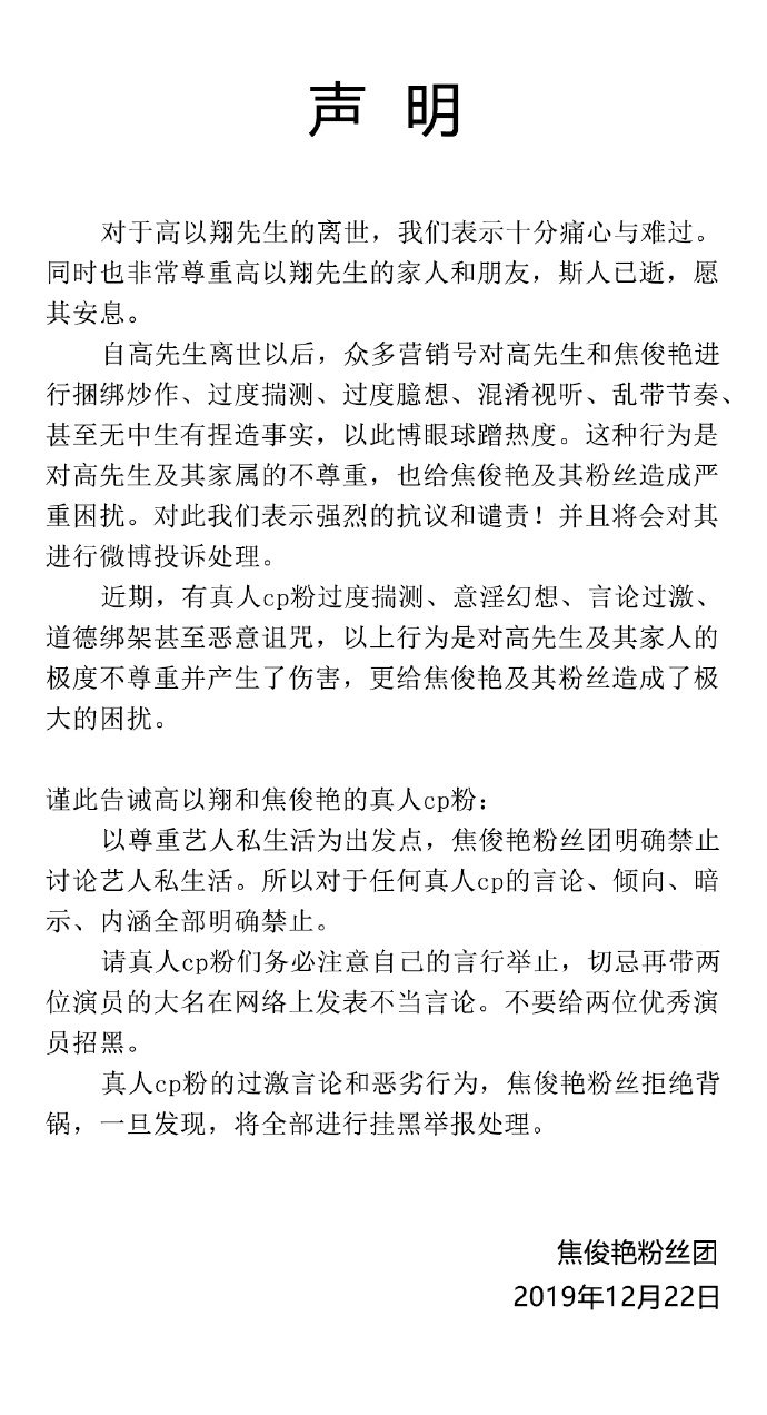 焦俊艳的语气还是相当温柔,但是内容还是相当强硬的,意思也很明白,那就是希望CP粉不要再杜撰绯闻,更不要再去恶意攻击高以翔女友。逝者为大,希望大家能够给以尊重。