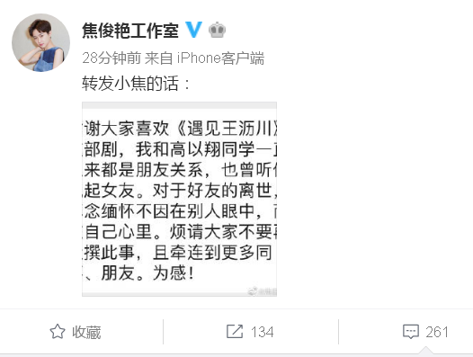 1月13日,焦俊艳工作室转发了焦俊艳的话,亲自拆了CP。在文中,焦俊艳首先感谢了大家对于《遇见王沥川》的喜爱,同时表明和高以翔是朋友关系,希望大家不要再杜撰此事,且牵连其他同事和朋友。