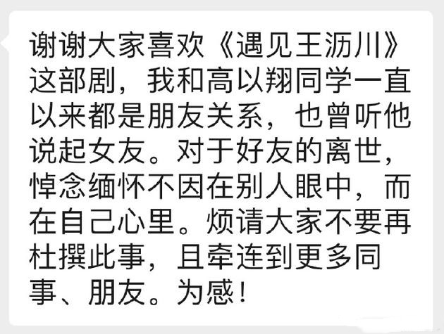 当天焦俊艳通过工作室发布声明:“谢谢大家喜欢《遇见王沥川》这部剧,我和高以翔同学一直以来都是朋友关系,也曾听他说起女友。对于好友的离世,悼念缅怀不因在别人眼中,而在自己心里。烦请大家不要再杜撰此事,且牵连到更多同事、朋友。为感。”