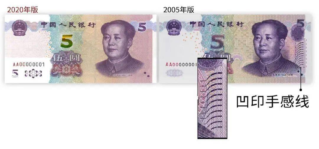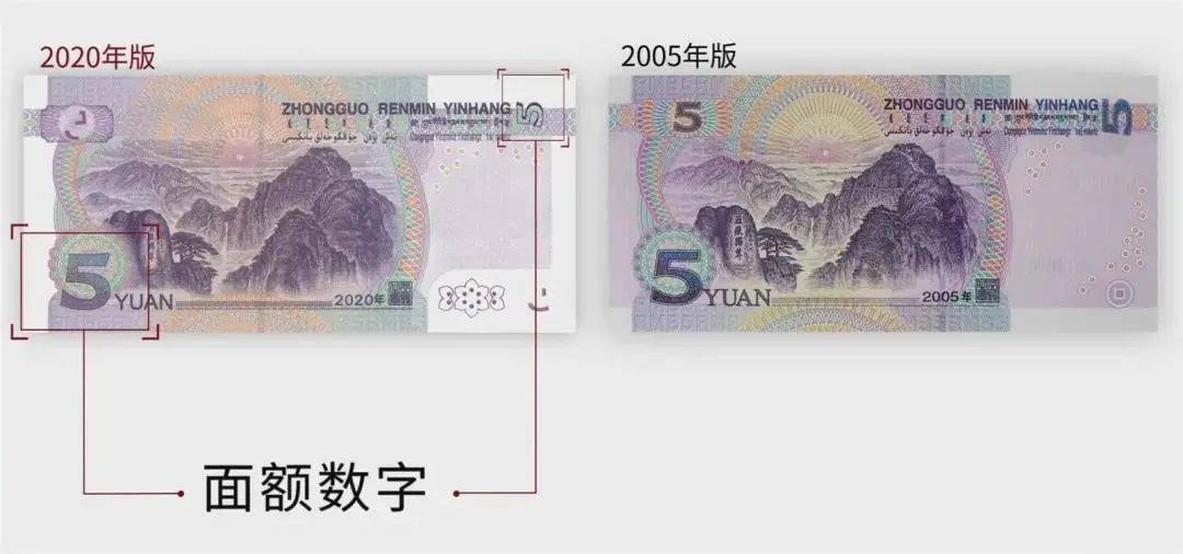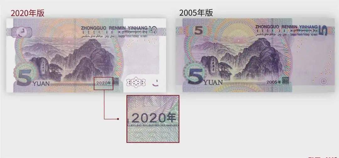2020年第五套人民币5元纸币保持了2005年第五套人民币5元纸币的规格、主要图案、主要颜色等元素不变,优化了正面结构层次和效果,提高了整体防伪性能。脸年号改为“2020”。