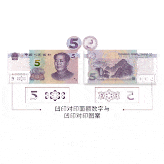 通过透明观察,前后图案构成完整的面额号和对比图案。