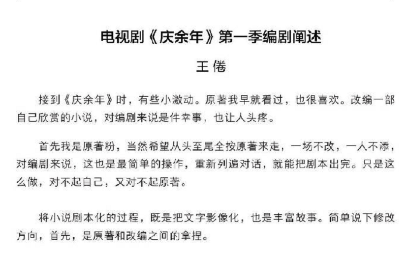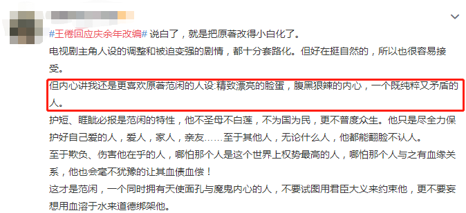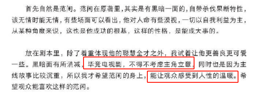 文中说到,他改编角色性格是因为“范闲”作为影视剧男主,必须要有正面的立意,同时《庆余年》整体基调沉重,编剧希望范闲身上有更多阳光可爱的成分。