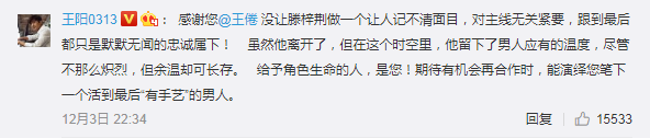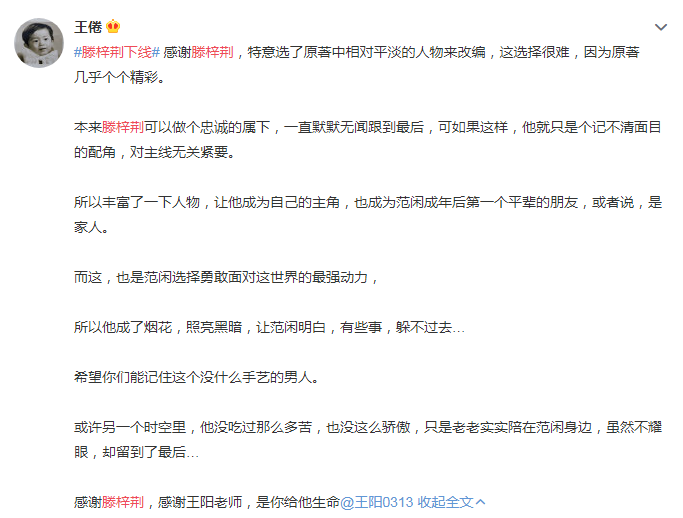 确实,是编剧让这个在原著相对平淡的角色变得有血有肉起来,观众眼泪还没擦干呢就赶去编剧动态下点赞,滕梓荆的饰演者王阳也在留言中表示感谢。