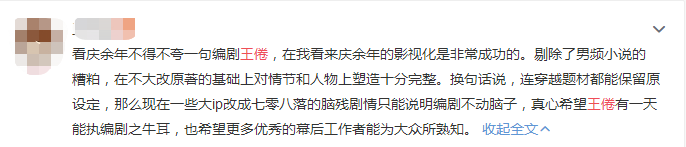 一部12年前的网文小说能获此评价,这样的事例也从侧面显示出了王倦对于《庆余年》这部小说的改编之成功。