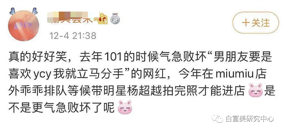 因为两人一起参加MIUMIU的活动,杨超越拍完照林小宅才可以进场,就有粉丝发微博内涵林小宅。