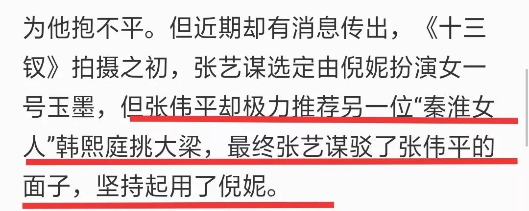 周晓枫曾是张艺谋的文学策划而在周晓枫的书里《宿命:孤独张艺谋》中提到两人在拍摄《金陵十三钗》中发生过严重的冲突,剧中的“玉墨”张艺谋已经决定倪妮当女主但张伟平却要换女主让另一名“秦淮女”韩熙庭挑大梁,最终因为张艺谋的坚持,倪妮成功成为女主,很显然倪妮饰演的“玉墨”风情万种却不失大义十分出挑。