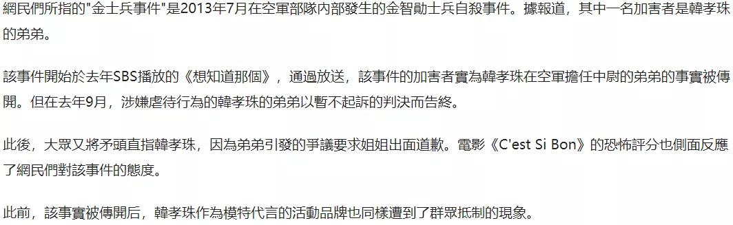 就算是和男星传绯闻,网友也懒得关心,而是留言要求重新调查韩孝周弟弟事件,更有人称他们一家为“暴力加害家族”,口碑一落千丈。