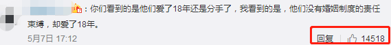 但是小8看到了一个热评非常好的观点,是“你们看到的是他们爱了18年还是分手了,我看到的是,他们没有婚姻制度的责任束缚,爱了18年。”